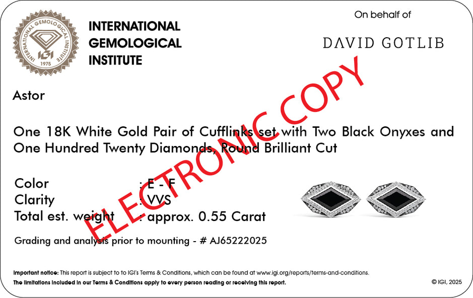 Every pair of cufflinks is delivered in our distinctive premium box, accompanied by its IGI certificate, ensuring unparalleled quality and authenticity.