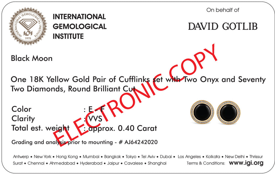 Every pair of cufflinks is delivered in our distinctive premium box, accompanied by its IGI certificate, ensuring unparalleled quality and authenticity.