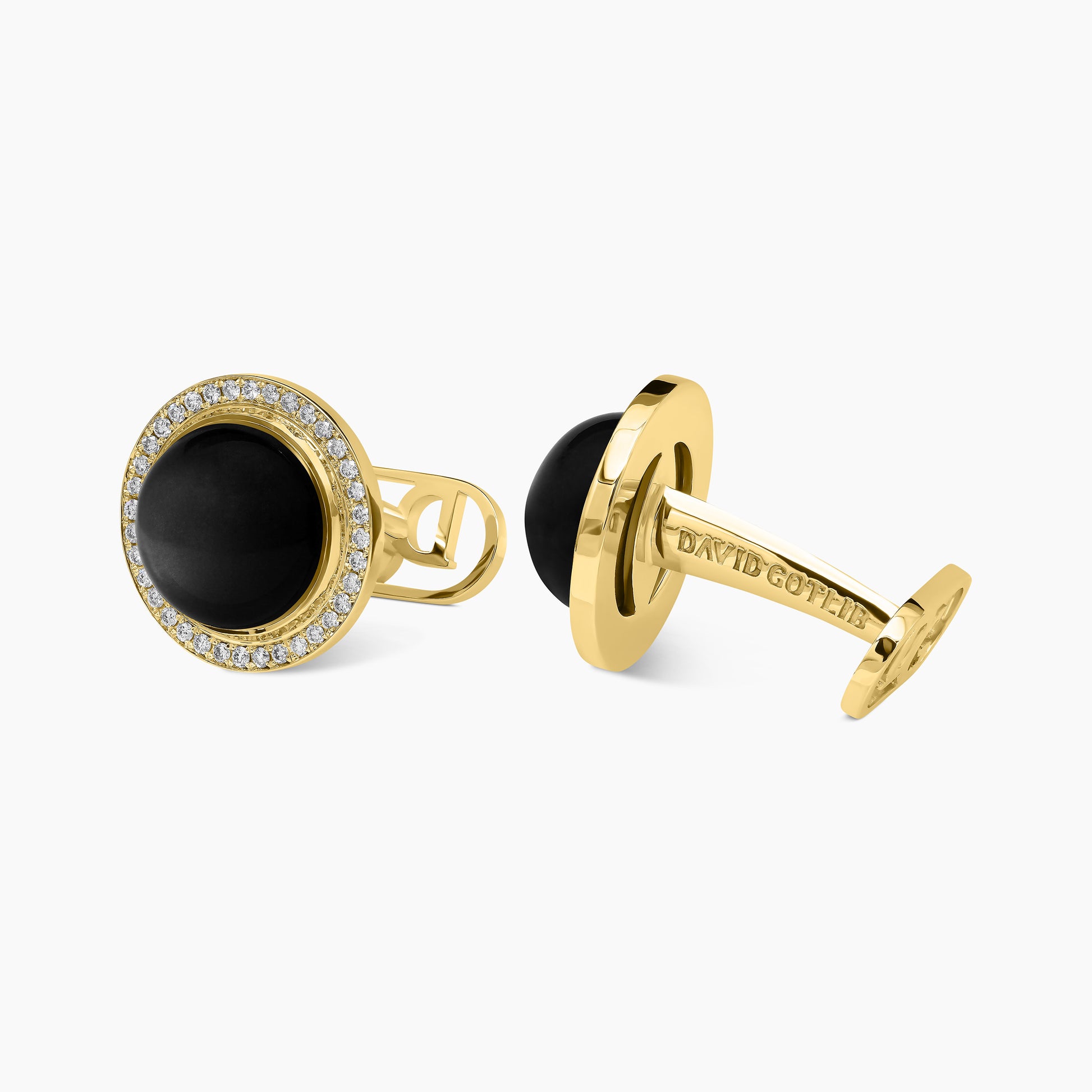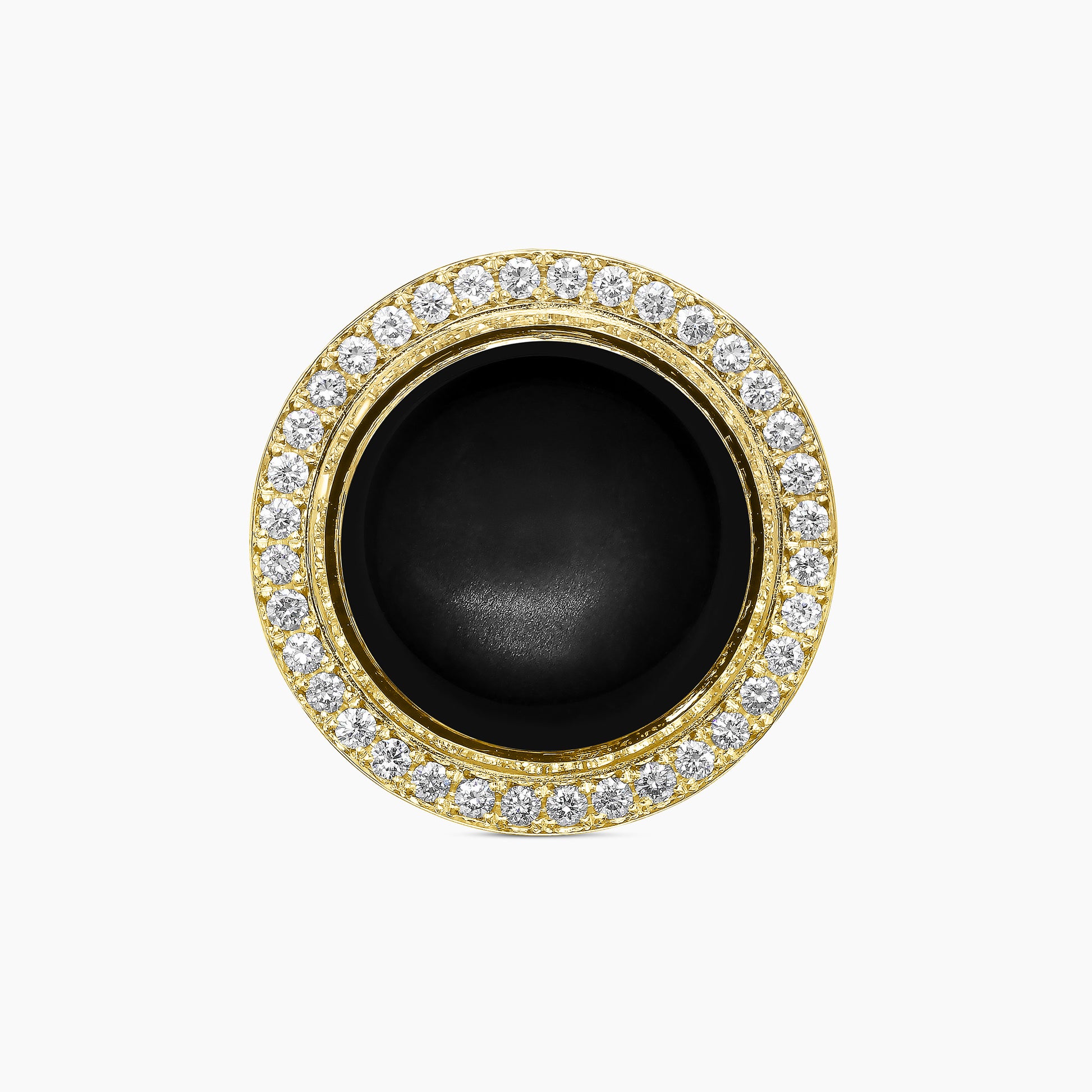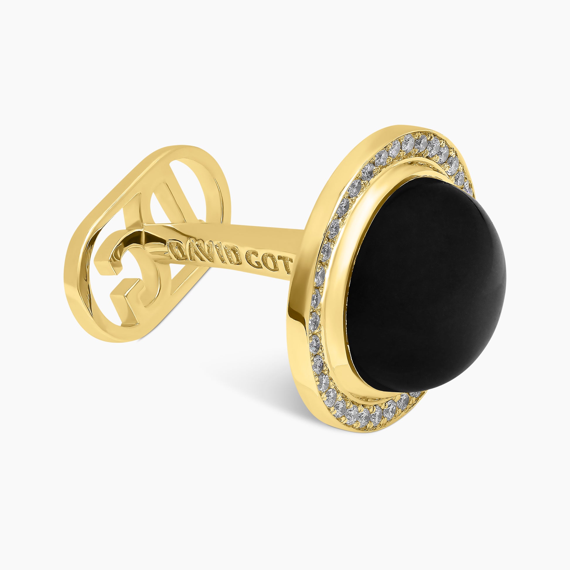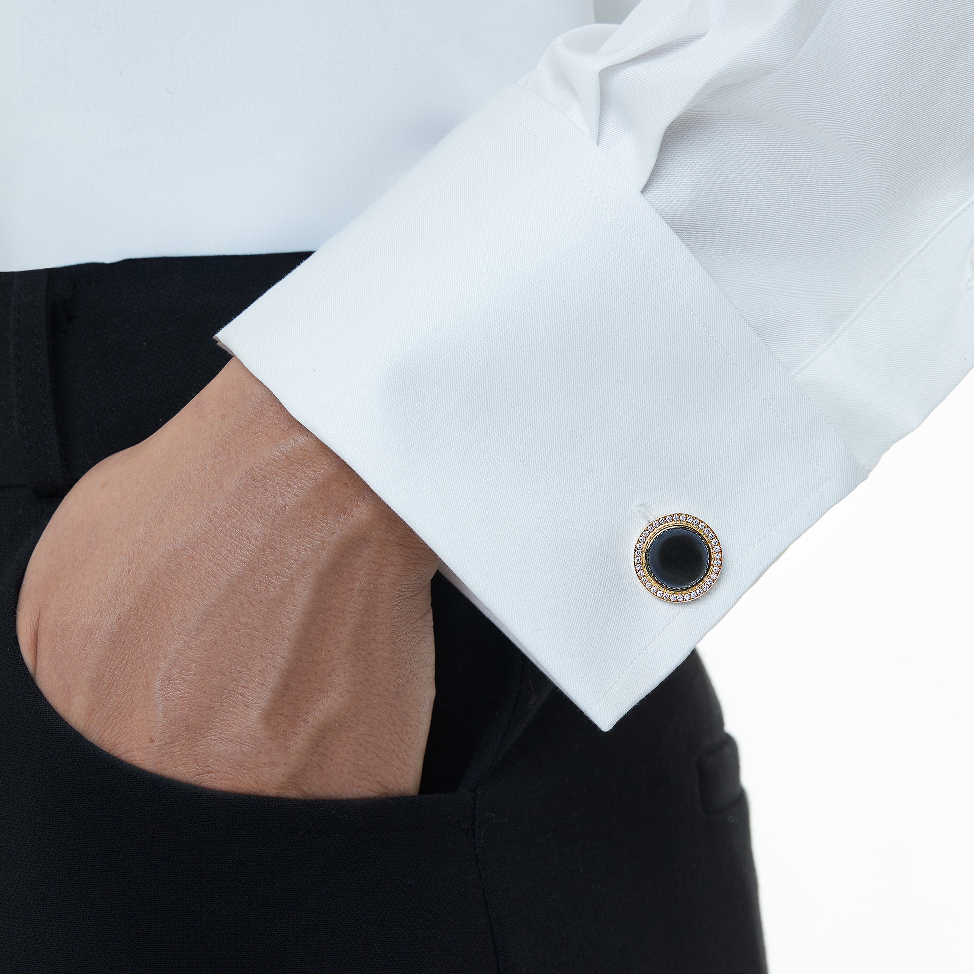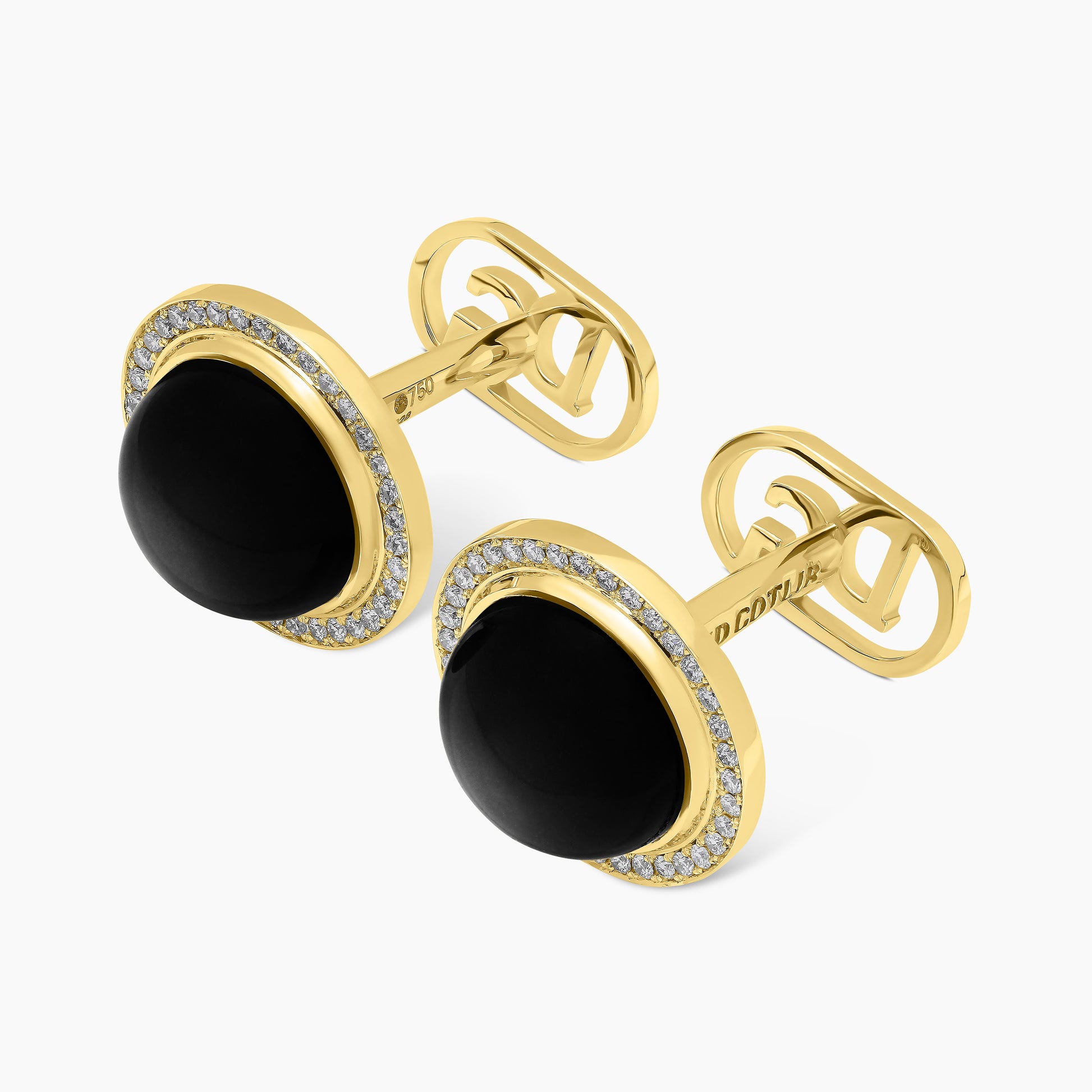 The mysterious, infinite depth of two black onyx gemstones, bezel-set in 18Kt gold and surrounded by 72 round brilliant white diamonds, evokes the beauty of the infinite and the allure of the unknown.