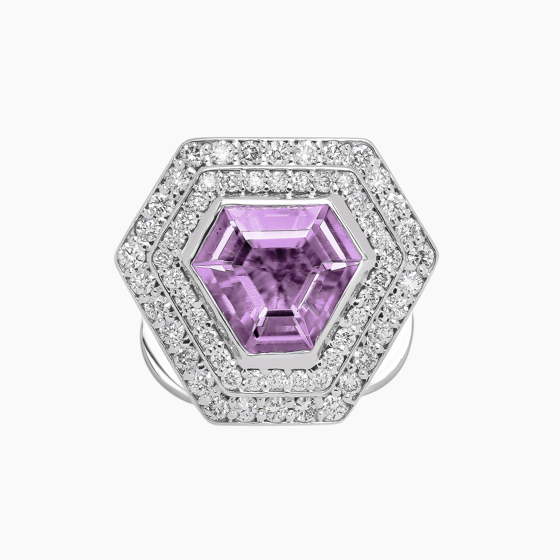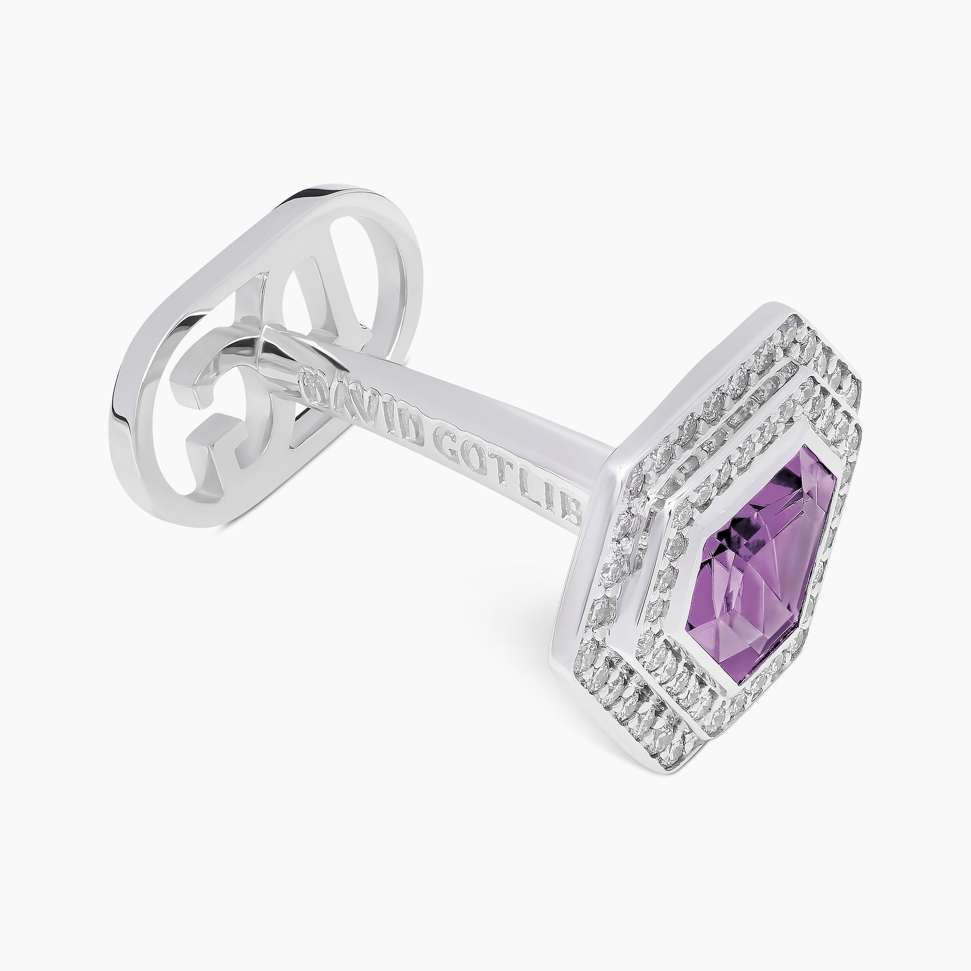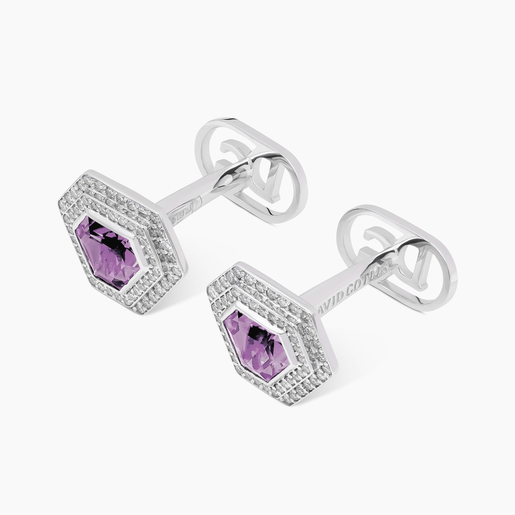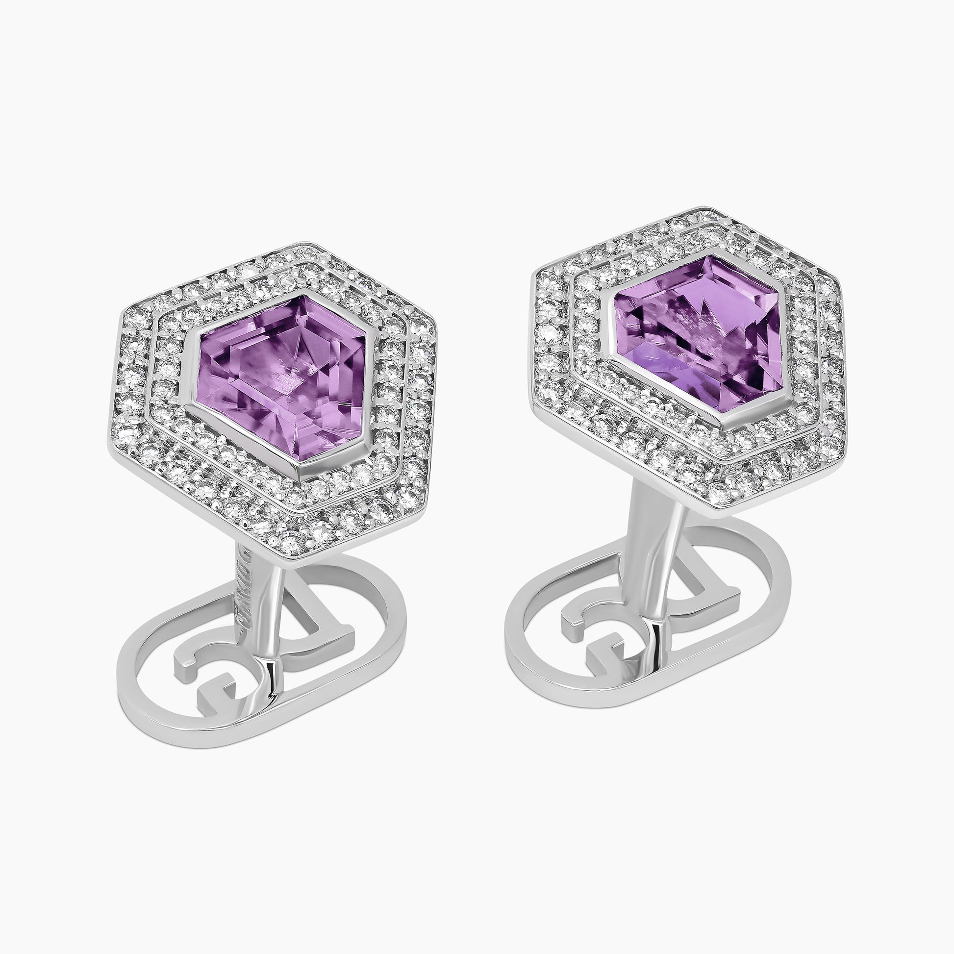 These 18k white gold cufflinks embody a harmonious interplay of light and form, featuring a central colored gemstone surrounded by 126 white diamonds. This arrangement creates a striking architecture of reflection, casting light in multiple directions to enhance the modern, geometric design, bringing to life a piece that radiates sharp sophistication.