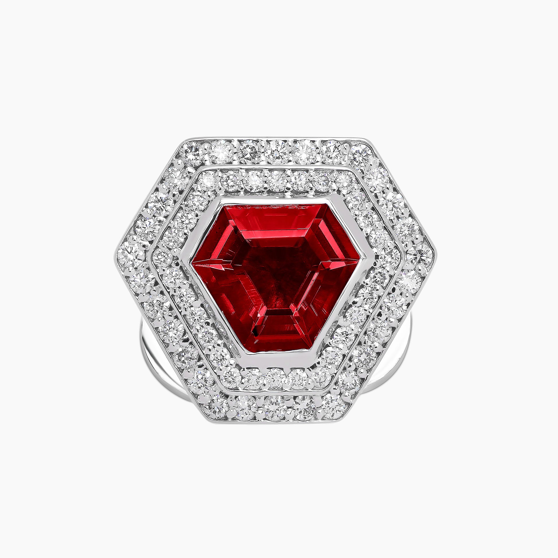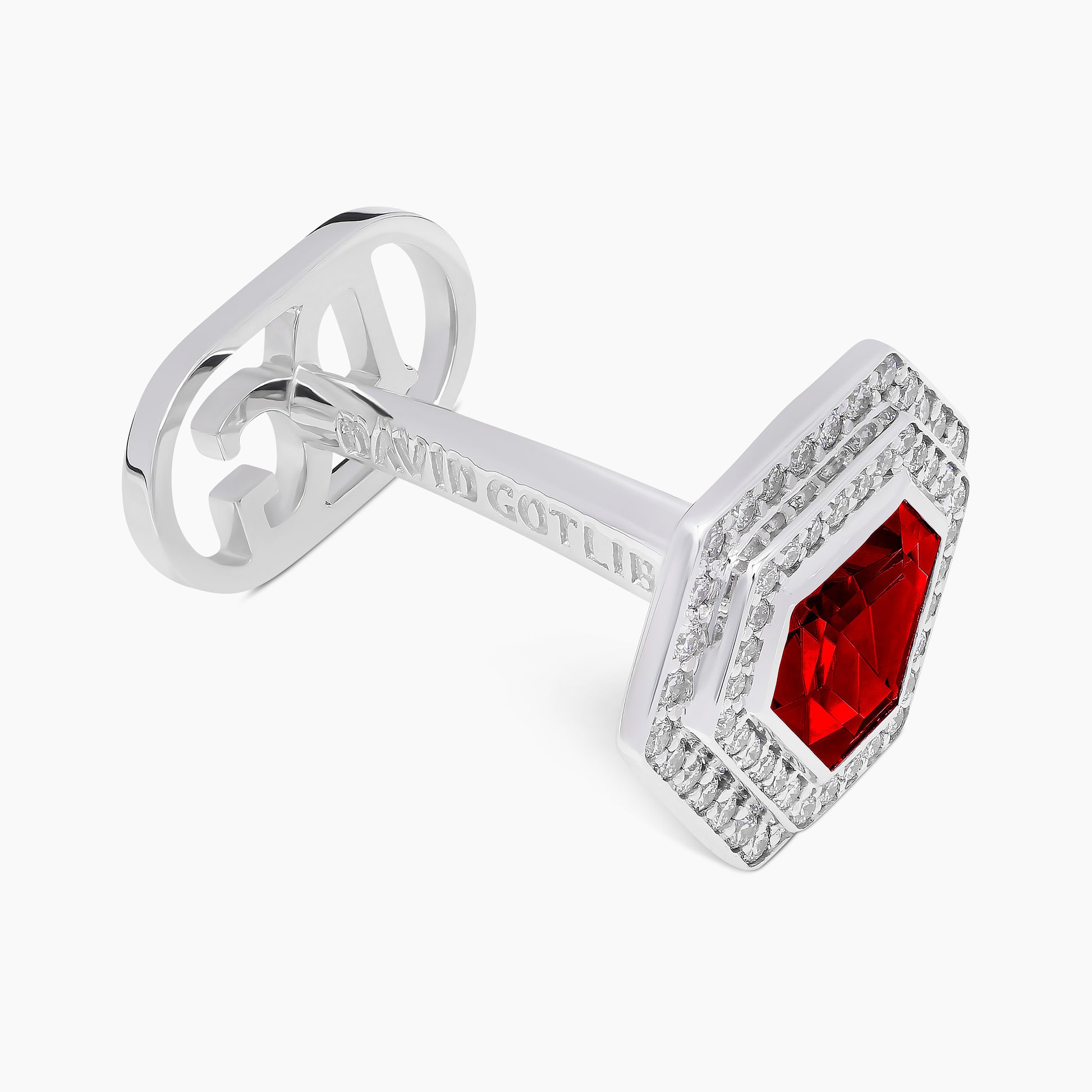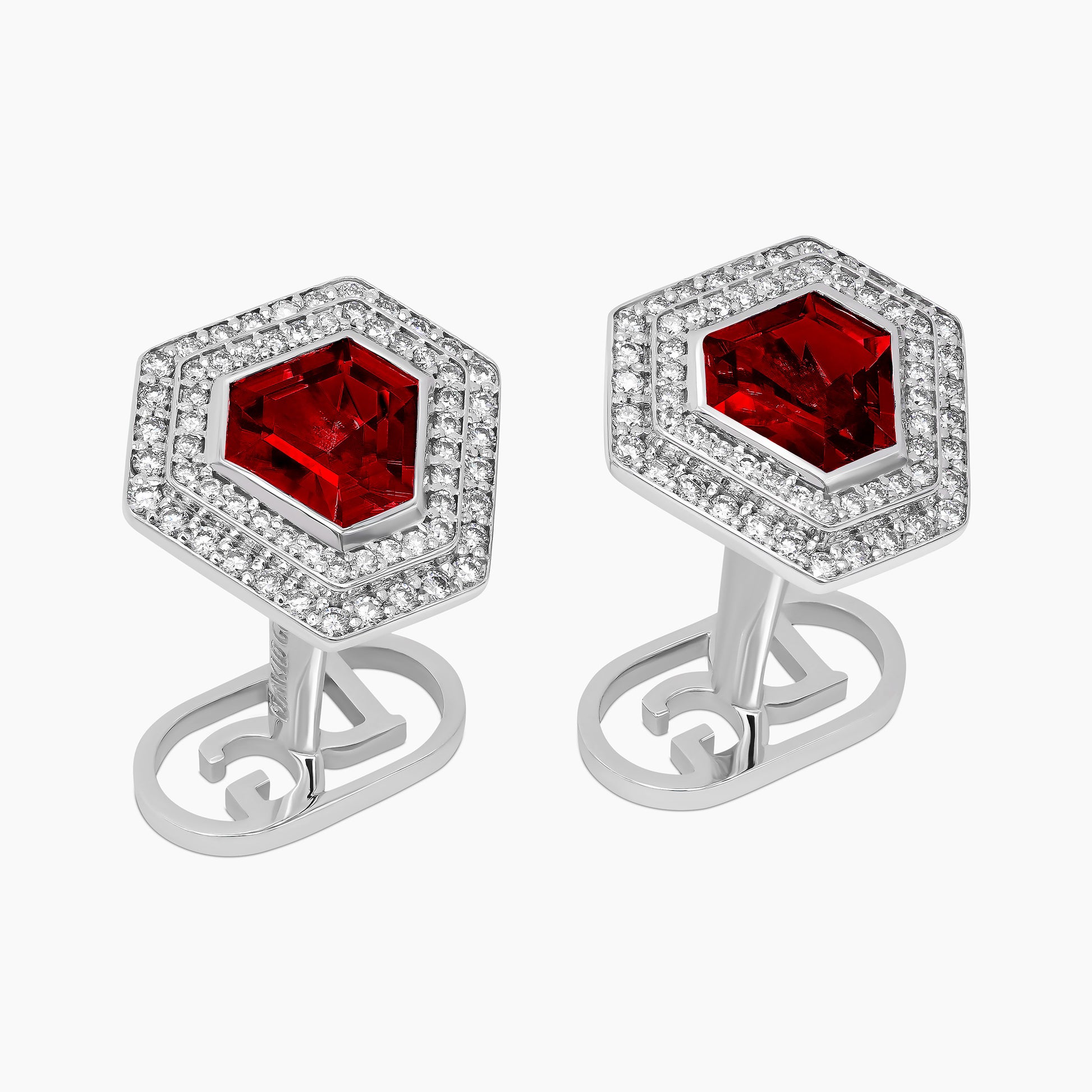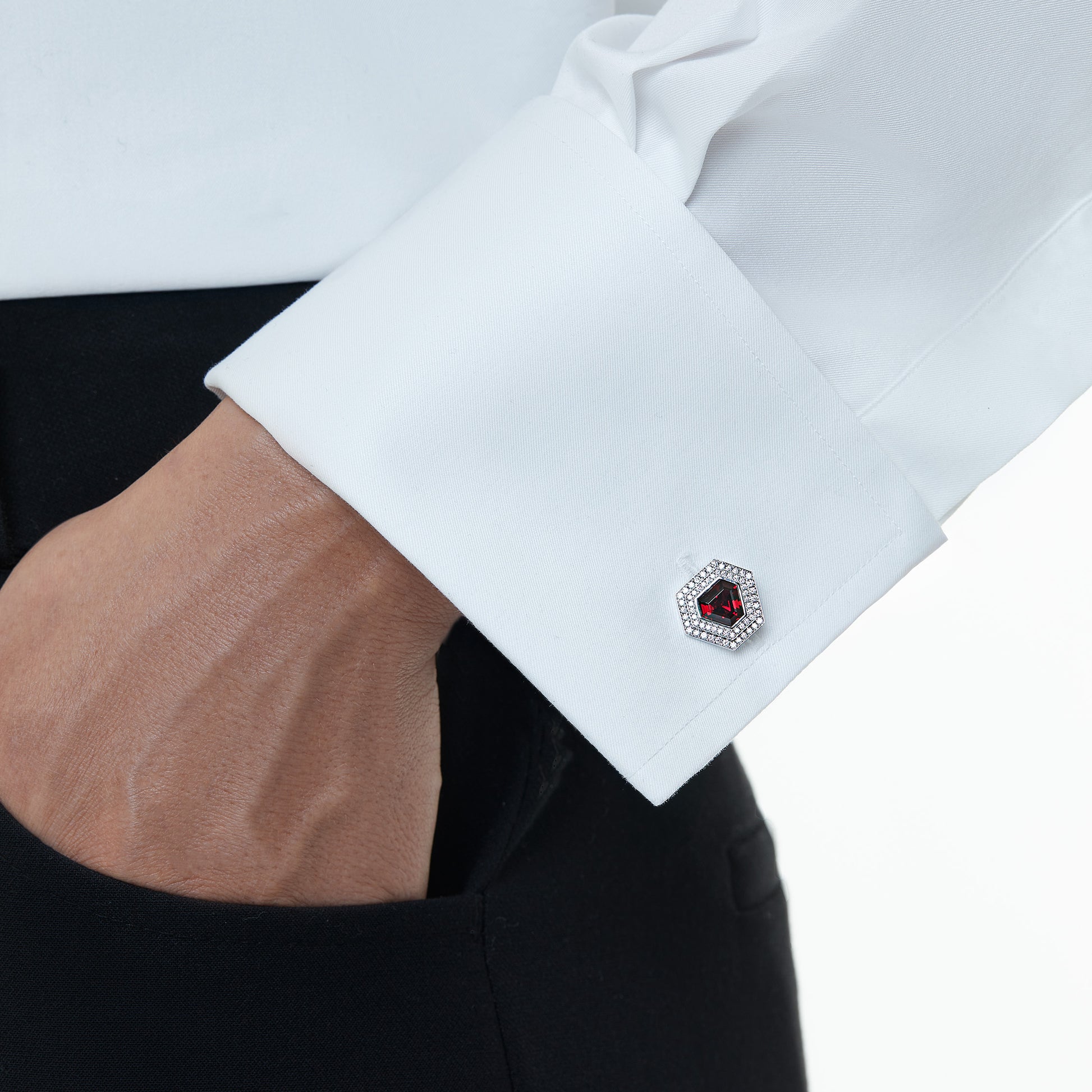 These 18k white gold cufflinks embody a harmonious interplay of light and form, featuring a central colored gemstone surrounded by 126 white diamonds. This arrangement creates a striking architecture of reflection, casting light in multiple directions to enhance the modern, geometric design, bringing to life a piece that radiates sharp sophistication.