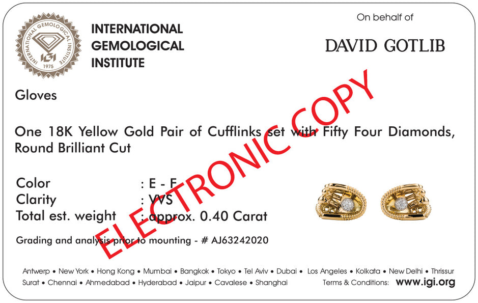 Every pair of cufflinks is delivered in our distinctive premium box, accompanied by its IGI certificate, ensuring unparalleled quality and authenticity.