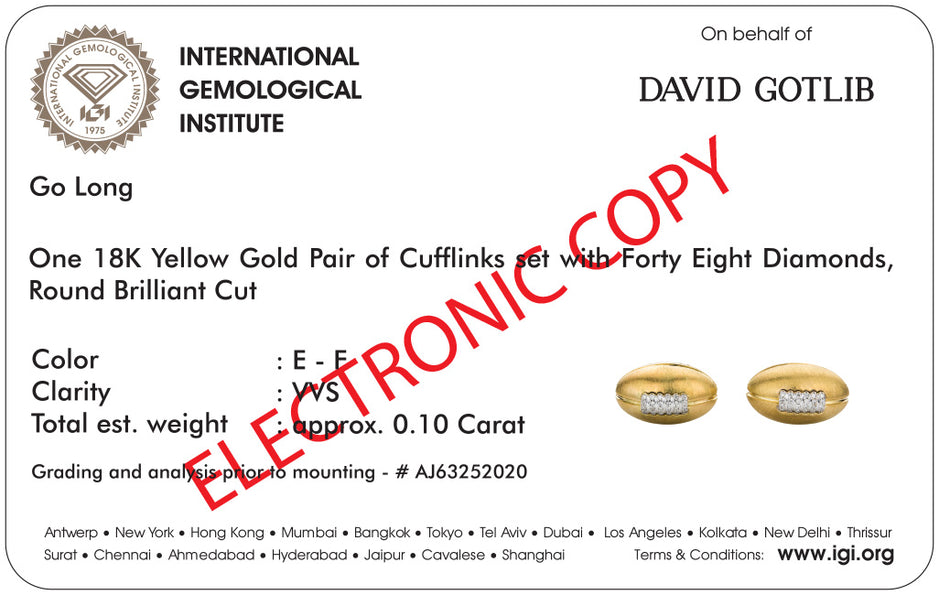 Every pair of cufflinks is delivered in our distinctive premium box, accompanied by its IGI certificate, ensuring unparalleled quality and authenticity.