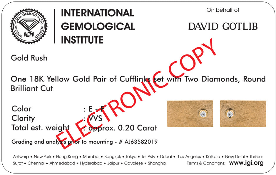 Every pair of cufflinks is delivered in our distinctive premium box, accompanied by its IGI certificate, ensuring unparalleled quality and authenticity.