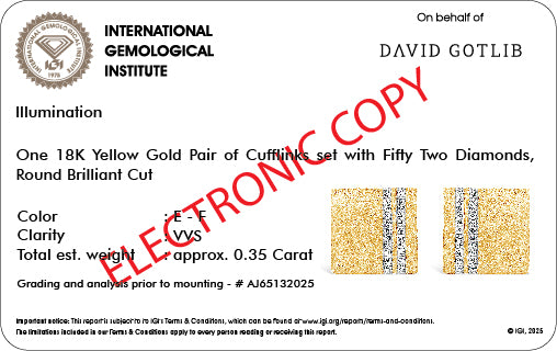 Every pair of cufflinks is delivered in our distinctive premium box, accompanied by its IGI certificate, ensuring unparalleled quality and authenticity.