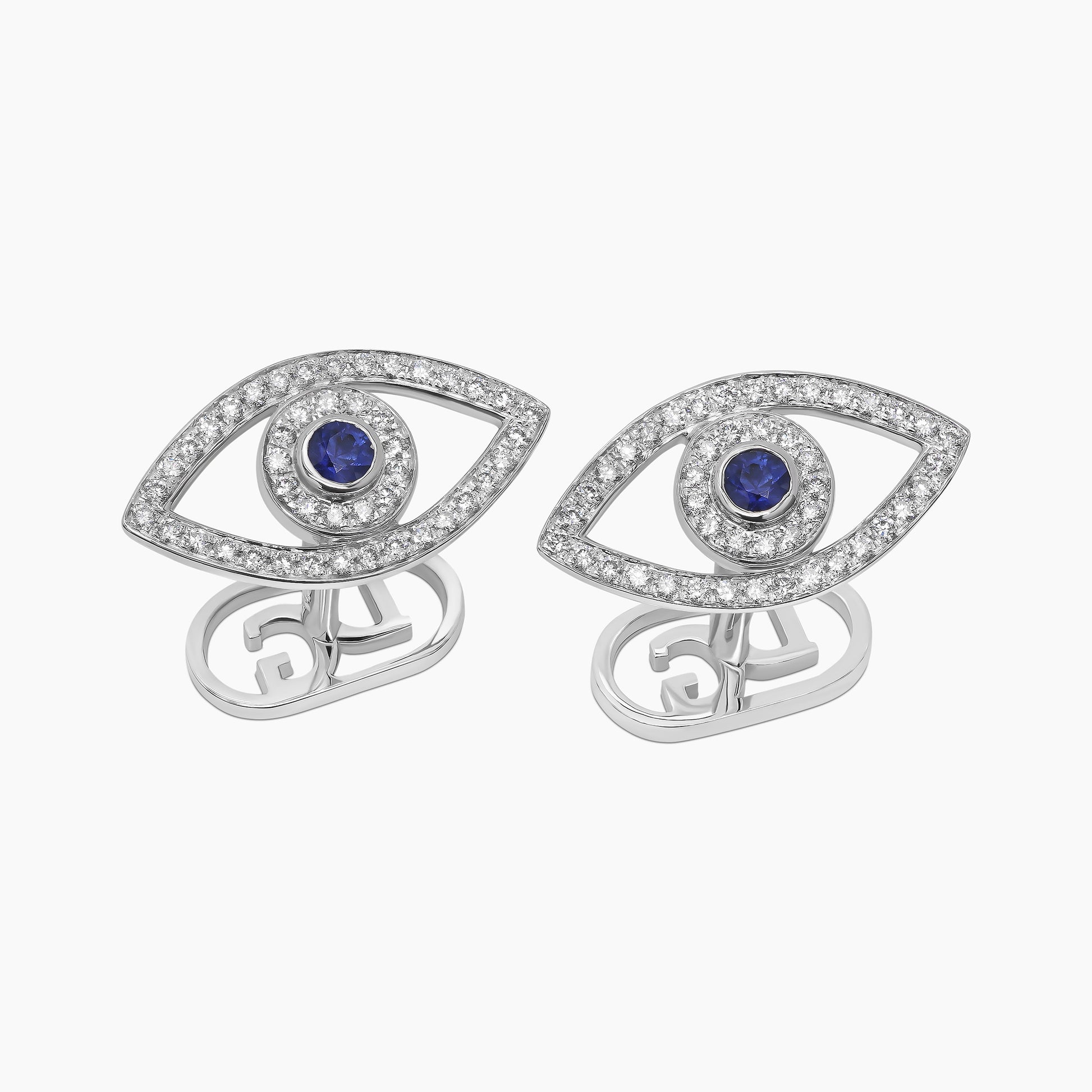 Crafted in 18k white gold, these cufflinks feature a sleek lucky eye design, set with 84 white round brilliant diamonds and two deep blue sapphires. A refined symbol of protection, elegance, and charm.